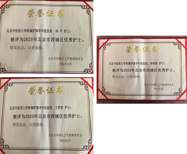 我院护士孙宇、王贺春、周秋香获得“西城区优秀护士”。