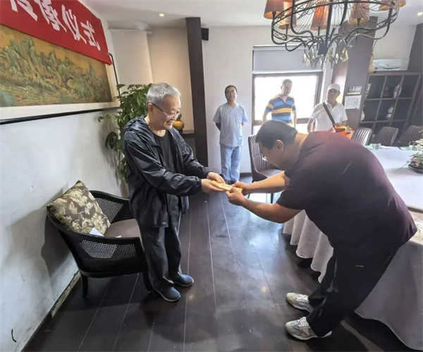 青年医师周乔在宫廷正骨第五代传人周俊杰主任见证下,依古礼行拜师大典,通过跪拜、敬茶、呈拜师帖、献束脩礼等仪式,刘钢主任亲授回徒帖,并赠古籍《医宗金鉴》,正式列入宫廷正骨第六代传承谱系。