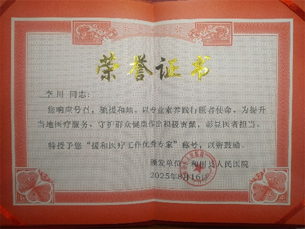 入疆以来,李川主治医师从医疗、教学、科室建设等方面积极推进和田县人民医院急诊科的科室发展,在2025年第八届中国医师节庆祝活动中,荣获和田县人民医院颁布的“援和医疗工作优秀专家”称号。
